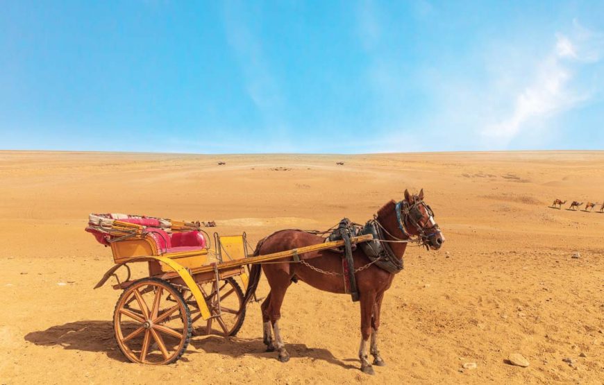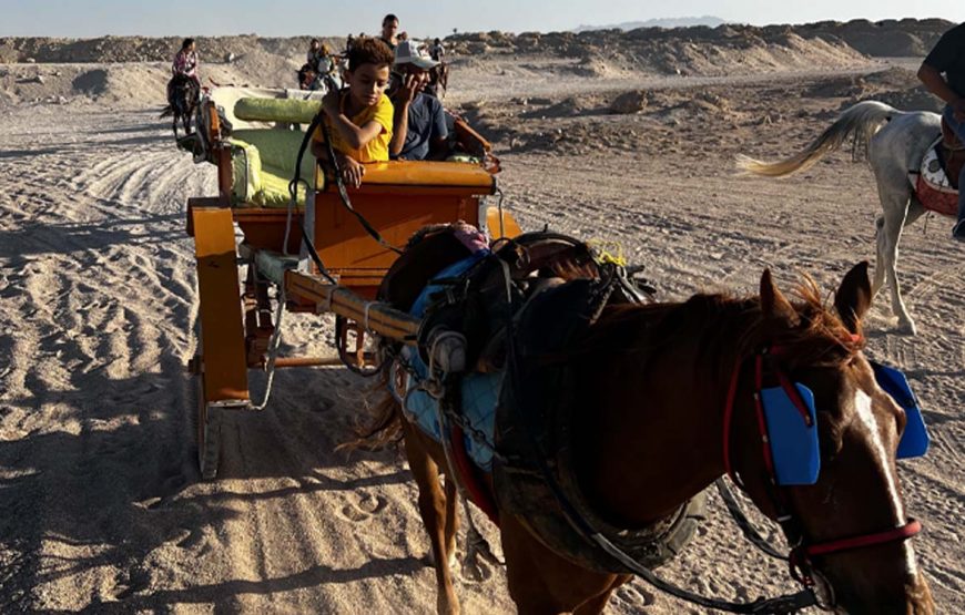 Profitez le temps d’une balade en calèche pour admirer un paysage magnifique avec un décor désert . Pour finir la journée on vous proposera un diner et spectacle oriental au coeur du meilleur centre équestre d’Hurghada.